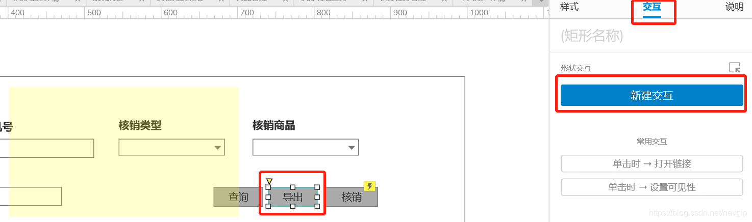 五、单击需要触发弹窗的按钮,选择“交互”-“新建交互”。