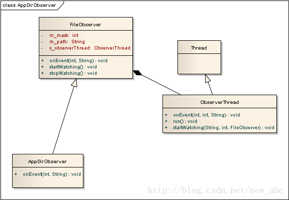 AppDirObserver继承自FileObserver,而FileObserver有一个ObserverThread类型的变量s_observerThread