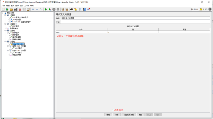 2.线程组右键,监听器中选择用户定义的变量,点击添加,增加一个变量及对应值。