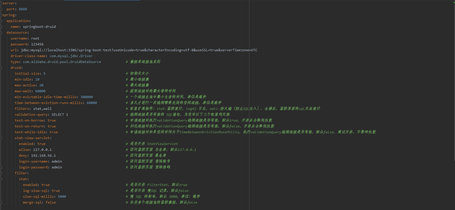 filters: stat,wall # 配置扩展插件:stat-监控统计,log4j-日志,wall-防火墙(防止SQL注入),去掉后,监控界面的sql无法统计