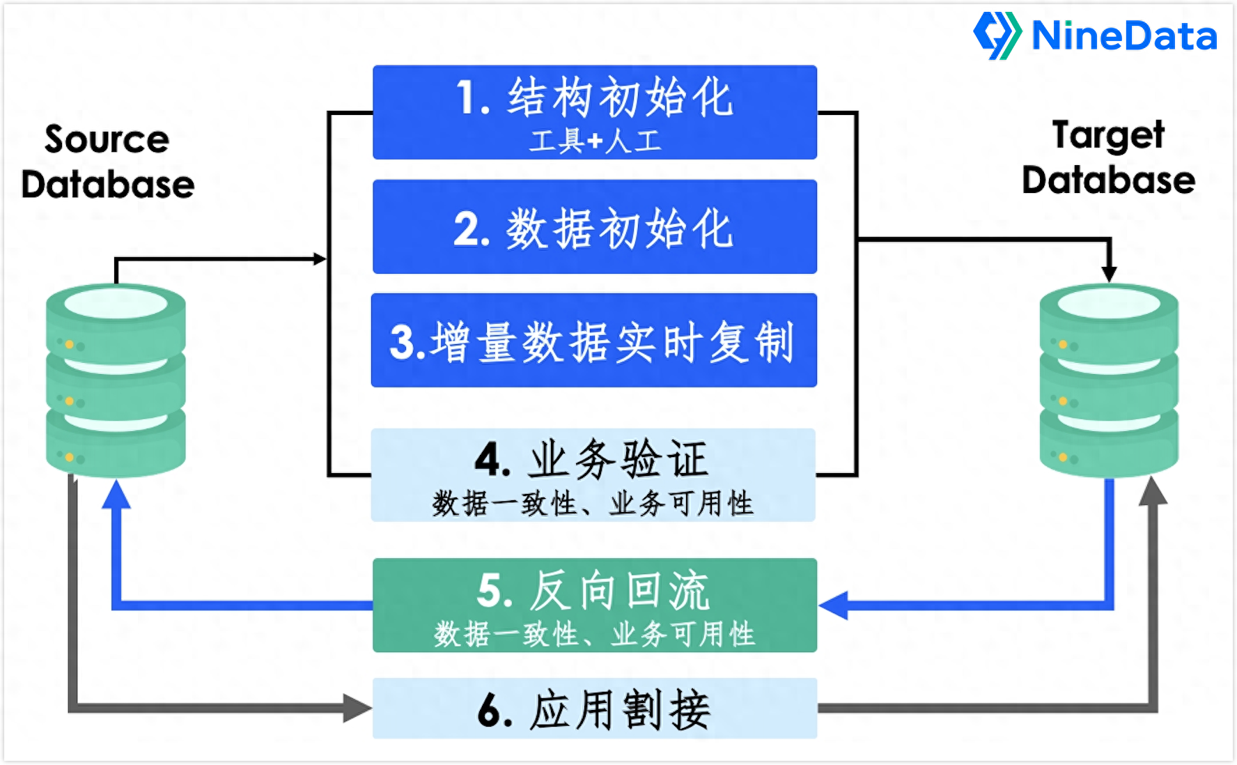 最大程度降低“去O”的迁移风险 业务流量顺利切回到 Oracle,企业利用 NineData 在确保所有数据安全留存的情况下,实现了新旧系统之间的随心切换。当新平台的问题完全解决后,企业可再次以同样的方式将业务流量切回到 PostgreSQL。这种灵活的双向同步机制,让企业在遇到问题时能够迅速回退,同时保证了数据的安全,不会因切换而丢失任何重要信息。