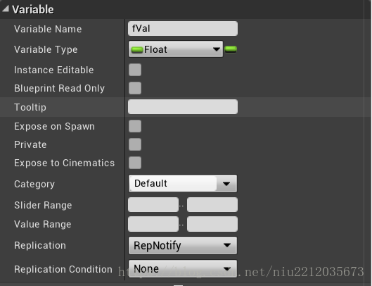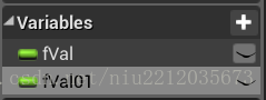 转到MyBlueprint面板,点击Variables右侧的’+’新建变量,并把变量命名为fVal。