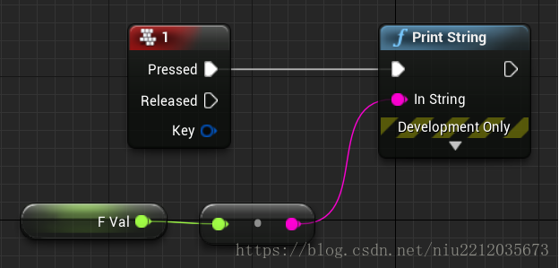 现在PrintString节点还没有事件调用,所以变量还无法输出,需要添加键盘事件节点。点击右键创建事件“1”节点,再连接执行引脚,这样在按下”1”键后,屏幕左上角就会打印出fVal的值,也就是5。点击Compile编译。