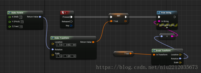 通过Make Transform构造Transform变量,给Transform变量赋值,同理可以通过Make Rotation节点构造Rotation变量。