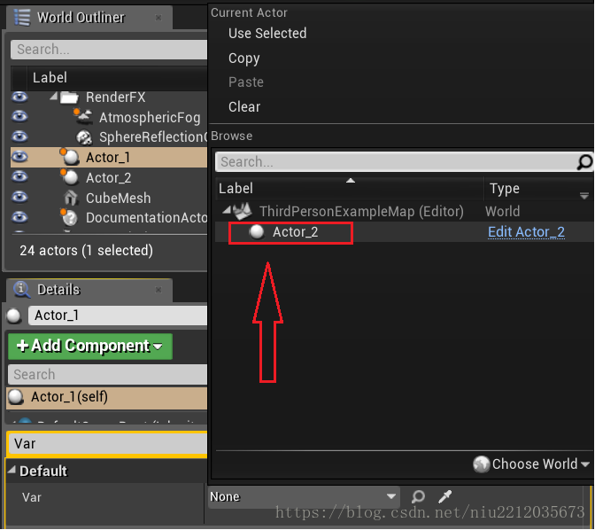 现在的变量Var还是空的,需要给他指定Actor_2蓝图类的实例,转到主界面选择Actor_1的实例,并找到变量Var
