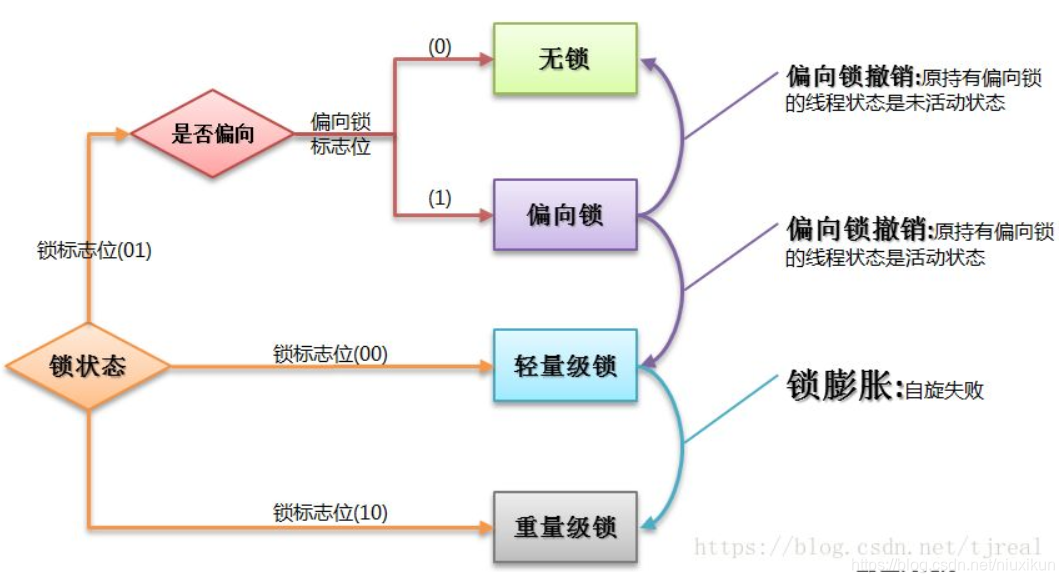 在Java中,锁共有4种状态,级别从低到高依次为:无状态锁,偏向锁,轻量级锁和重量级锁状态,这几个状态会随着竞争情况逐渐升级。锁可以升级但不能降级。