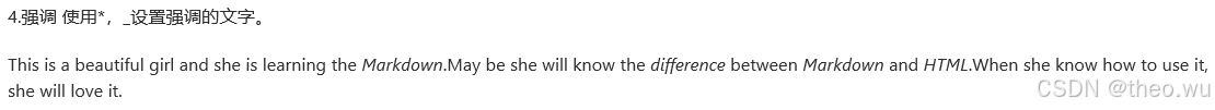 4.强调 使用*,_设置强调的文字。 This is a beautiful girl and she is learning the *Markdown*.May be she will know the _difference_ between _Markdown_ and *HTML*.When she know how to use it, she will love it.