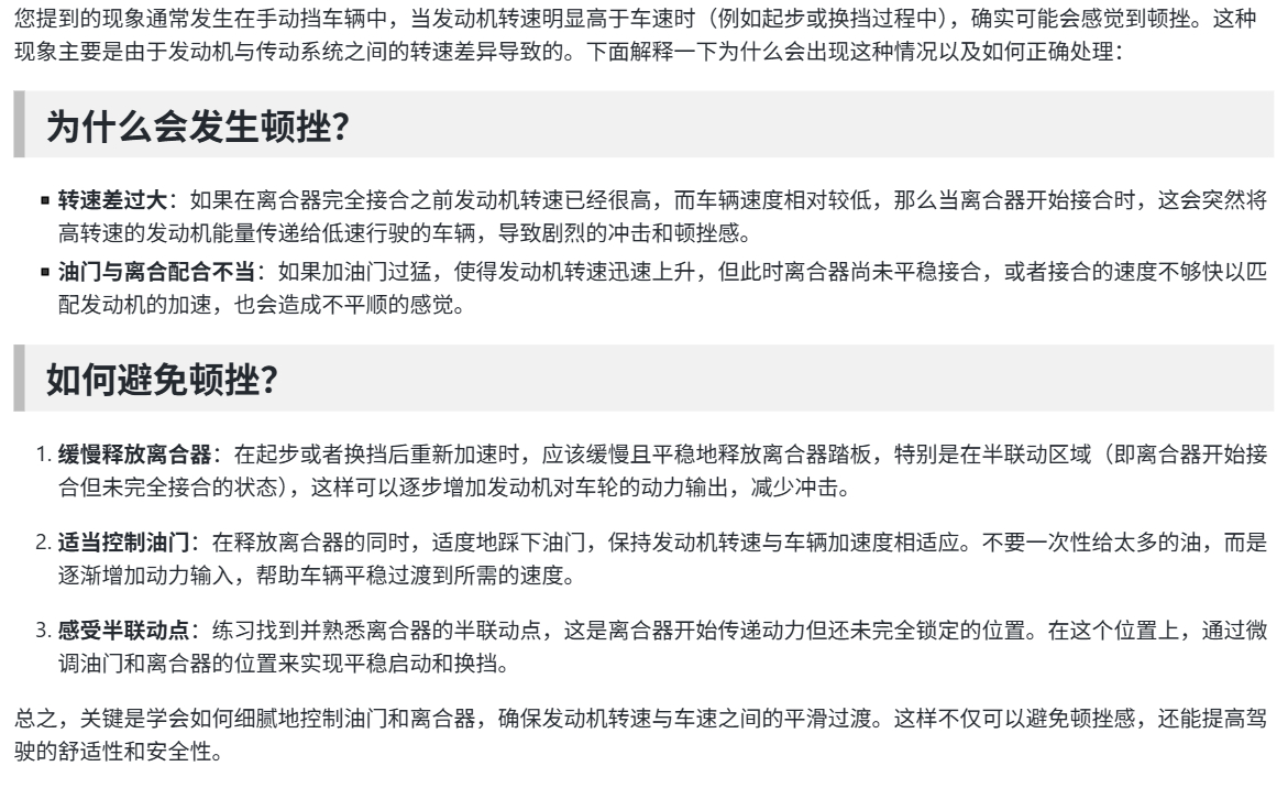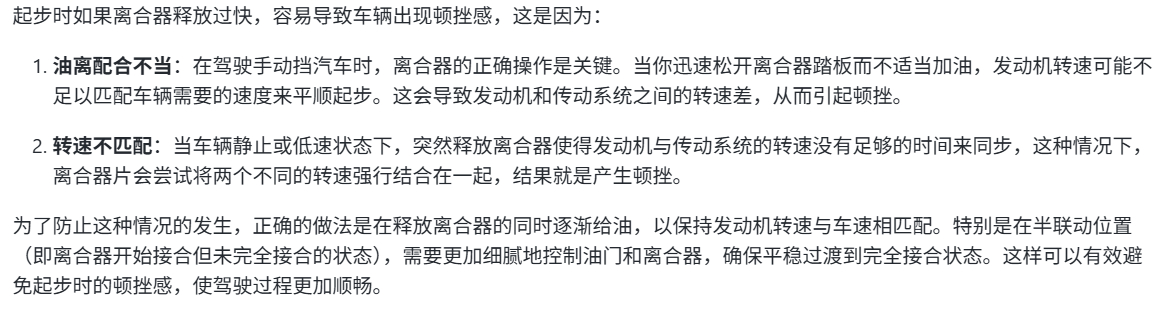 综上所述,“由于刹车的存在,这部分动力无法有效转化为车辆前进的动力”主要是指,在半坡起步时,如果刹车没有适时解除,即使发动机已经产生了足够的动力并通过半联动的离合器传递给了车轮,但由于刹车的持续作用,这部分动力无法转化为实际的车辆运动,反而可能导致车辆的抖动或不稳定状态。正确的操作方法是在保证足够动力的同时,适时地解除刹车,让车辆能够顺利起步。