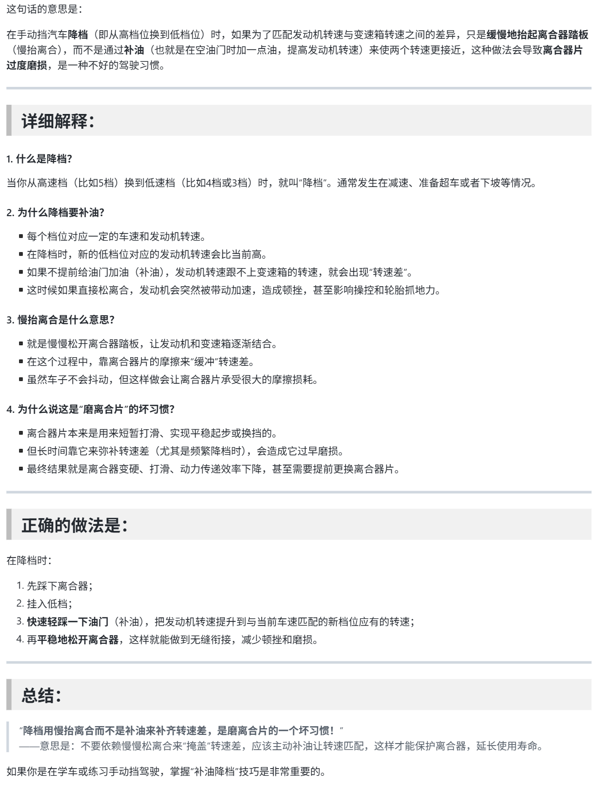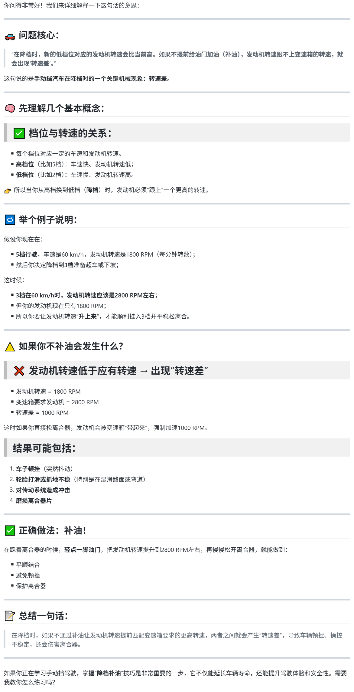 发动机与车轮之间的连接:在手动变速器中,除非挂入空档或分离离合器,发动机和车轮之间始终保持机械连接。这意味着当车轮停止转动时(例如你在刹车停车时),如果没有通过踩下离合器来切断发动机与传动系统的连接,发动机也会被迫减速直至停止运转,导致熄火。