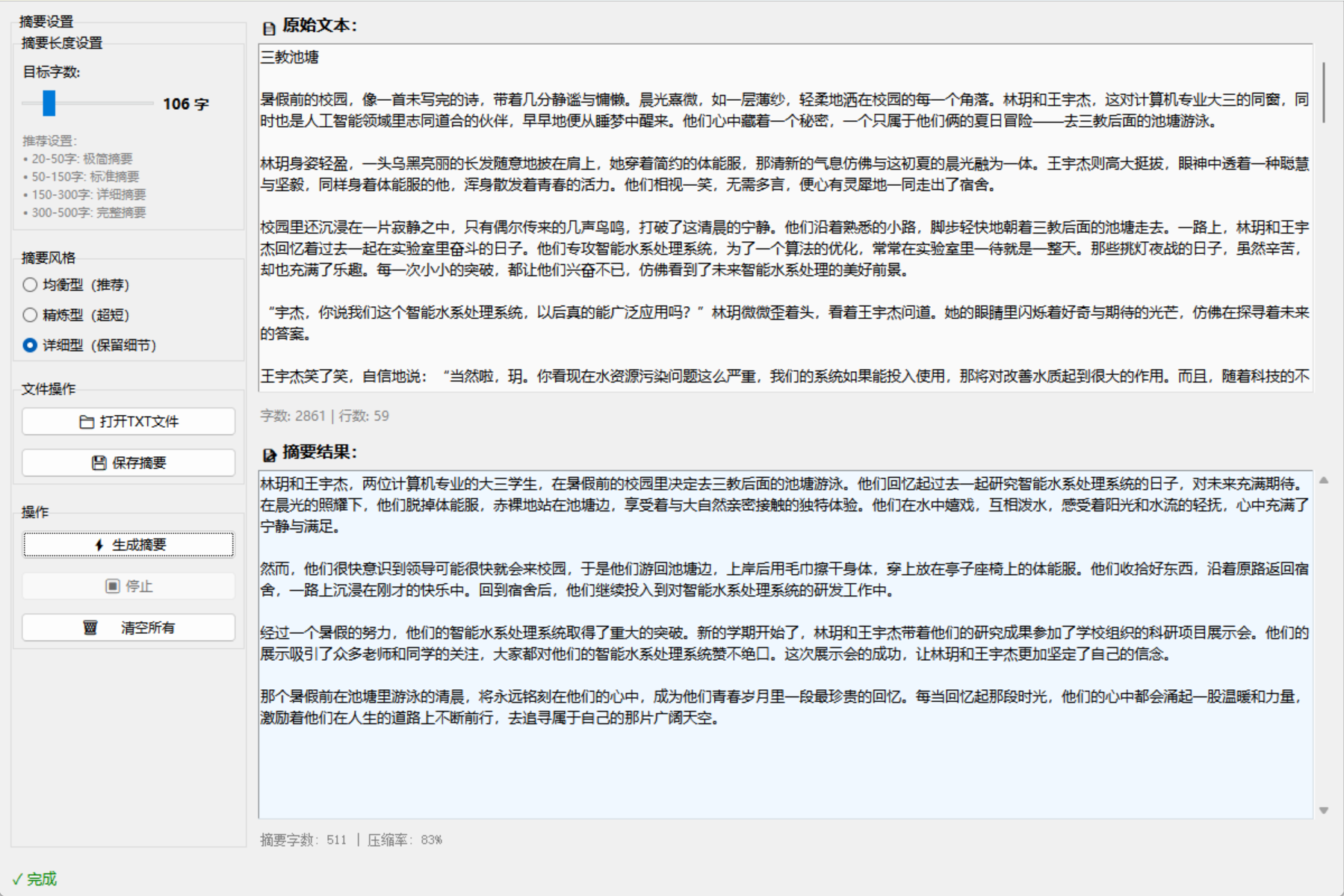 在每个文本区域下方都有一个统计标签。对于源文本,它显示字数和行数。对于摘要,它显示摘要的字数和压缩率。压缩率的计算公式是100 - (摘要字数 / 源文本字数) * 100,这给出了一个百分比,表示摘要相对于原文的缩减程度。例如,如果原文是1000字,摘要是200字,压缩率就是80%,表示摘要将文本缩减到了原来的20%。