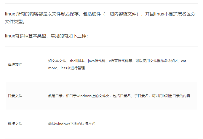 linux 所有的内容都是以文件形式保存,包括硬件(一切内容皆文件),并且linux不靠扩展名区分文件类型。