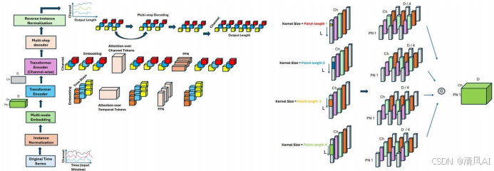 - 设计:输入序列通过4种不同长度的Patch(如8/16/24/48)分割,每尺度使用独立1D卷积映射至子空间(维度=dmodel/4),再拼接为统一特征表示。