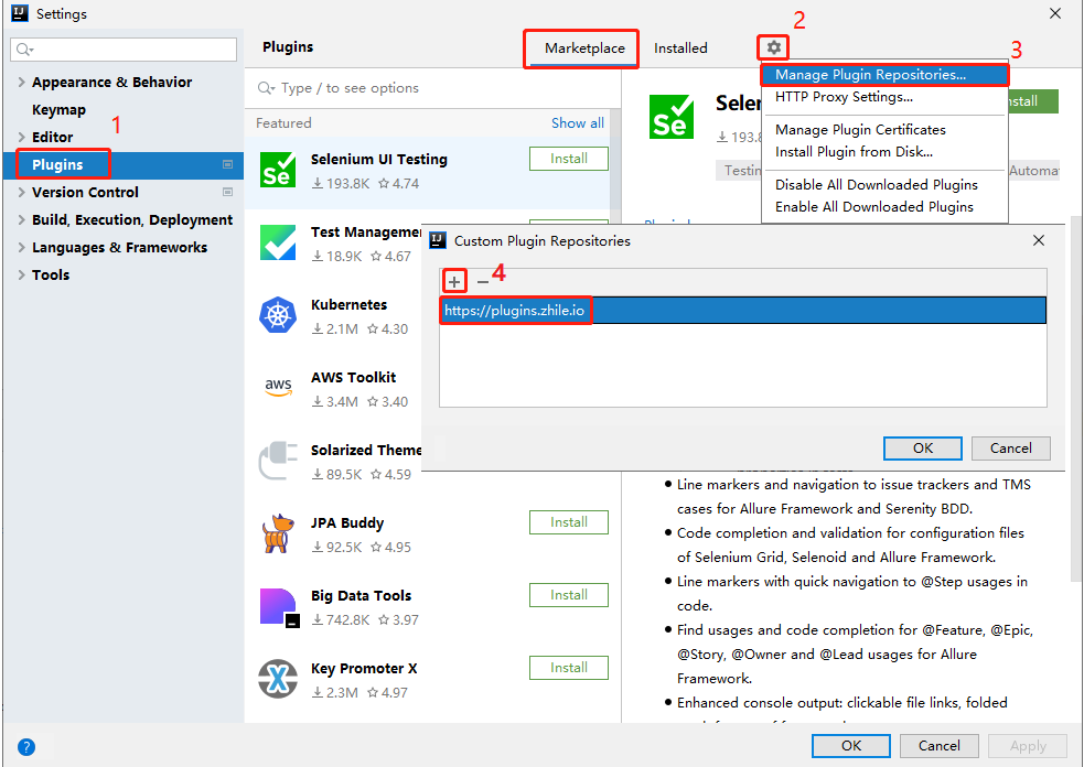 首先打开idea,点击菜单File -> Settings.. -> Plugins,然后添加第三方插件仓库的ip:https://plugins.zhile.io
