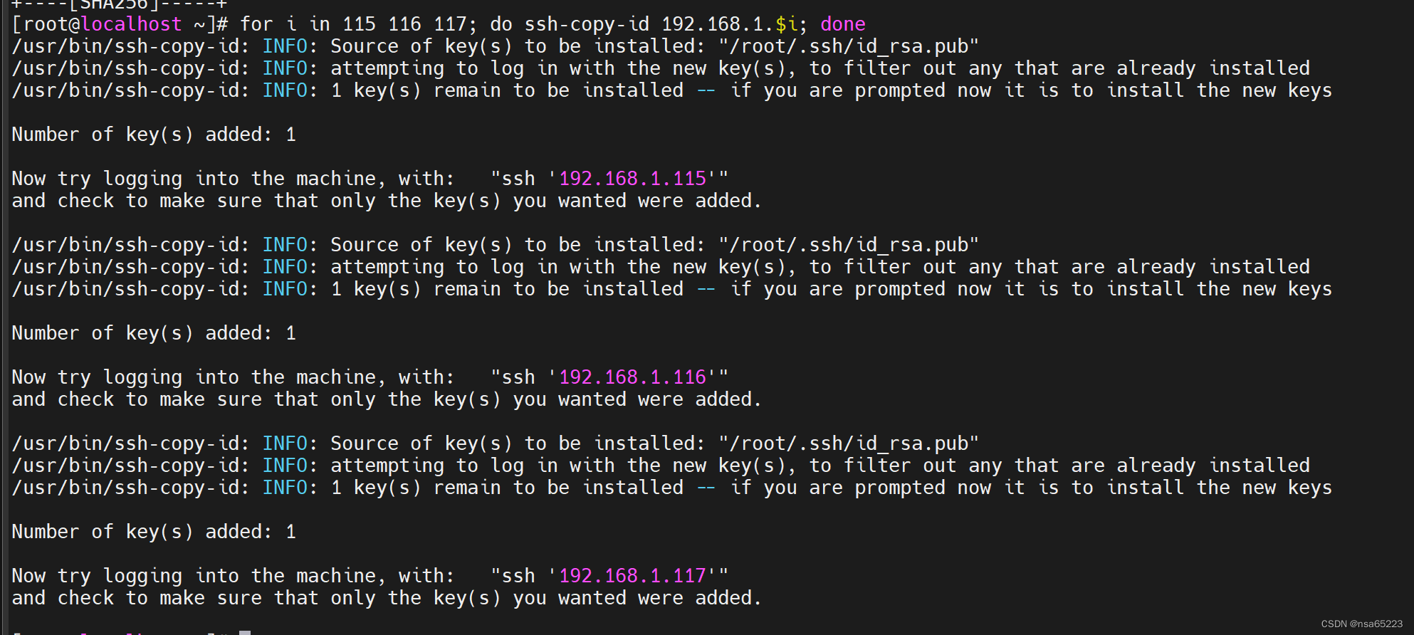 for i in 115 116 117; do ssh-copy-id 192.168.1.$i; done