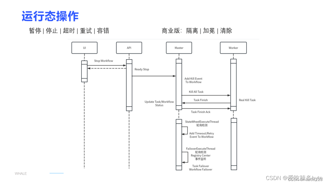 在介绍了正常流程后,还有一些与运行状态相关的操作,例如暂停和停止。我们可以通过页面上的操作来触发这些操作,例如触发停止,实际上任务的停止是执行在 Worker 节点上的,完成后也会经过 Finish-ack 的流程。