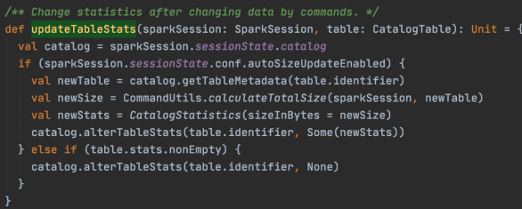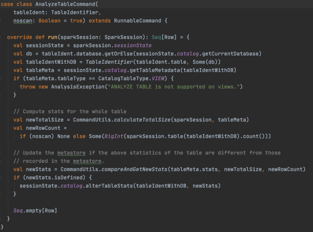另外,要主动更新statistics还是要运行Analyze命令[3],对于 AnalyzeTable 命令,除了更新spark.sql.statistics.totalSize之外,也会根据参数noscan是否关闭来判断更新spark.sql.statistics.numRows,源码如下。