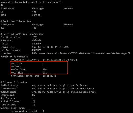 例如我们新创建一张hive分区表,然后用hive插入一些数据,此时通过describe formatted语句可以看到表级别的statistics: