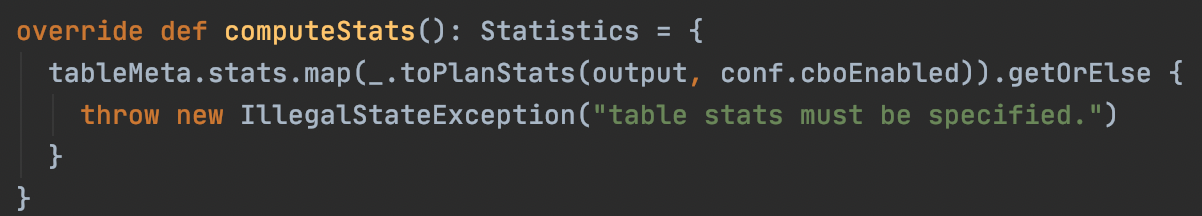 - 不考虑cbo开启的情况下(默认cbo也是不开启的),估算stats的代码位于SizeInBytesOnlyStatsPlanVisitor。