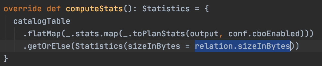 - 对于Hive表(HiveTableRelation),会直接取CatalogStatistics,也就是原始的Hive Statistics的totalSize。