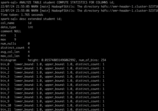 Spark字段级别统计信息包括了avgLen、distinctCount、min、max、maxLen、nullCount以及histogram。前面几个统计值都好理解,histogram比较特殊,需要开启spark.sql.statistics.histogram.enabled之后再运行Analyze才可以生成。histogram将字段值的分布切分成n个百分比位(n=spark.sql.statistics.histogram.numBins,默认值254),每一段bin内部会统计min/max和distinct_count。
