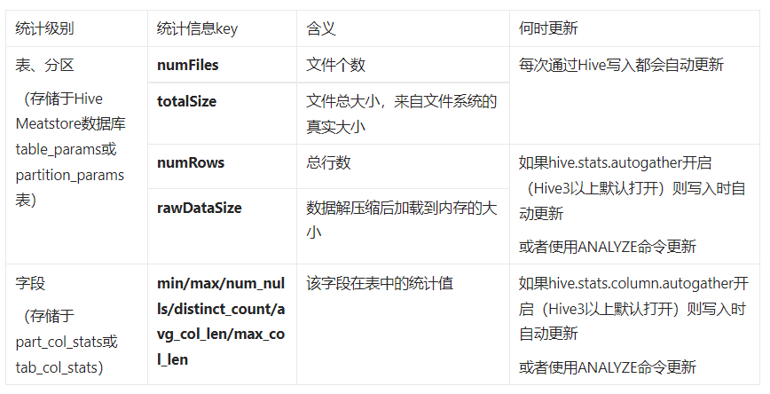 Hive Metastore里除了保存元数据库表之外,还会保存statistics(统计信息)[1]。statistics记录了表或分区的大小、行数等信息,可以用于查询优化。Hive会在表、分区、字段级别记录各自的统计信息,主要包括: