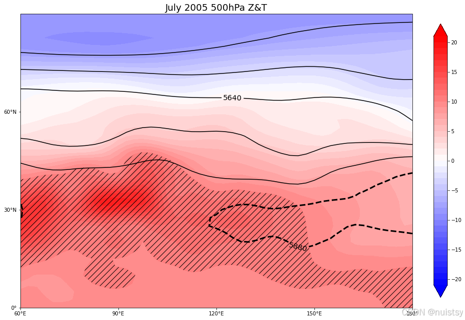 基于hgt.mon.mean.nc数据绘制500hpa高度场 从文件信息可以看出,hgt.mon.mean.nc的文件分别有四个变量。level 高度 总共17层,范围为10-1000hpa。time 时间 1948年1月1日-2021年7月1日。lat 纬度 范围-90-90。lon 经度 范围0-360。