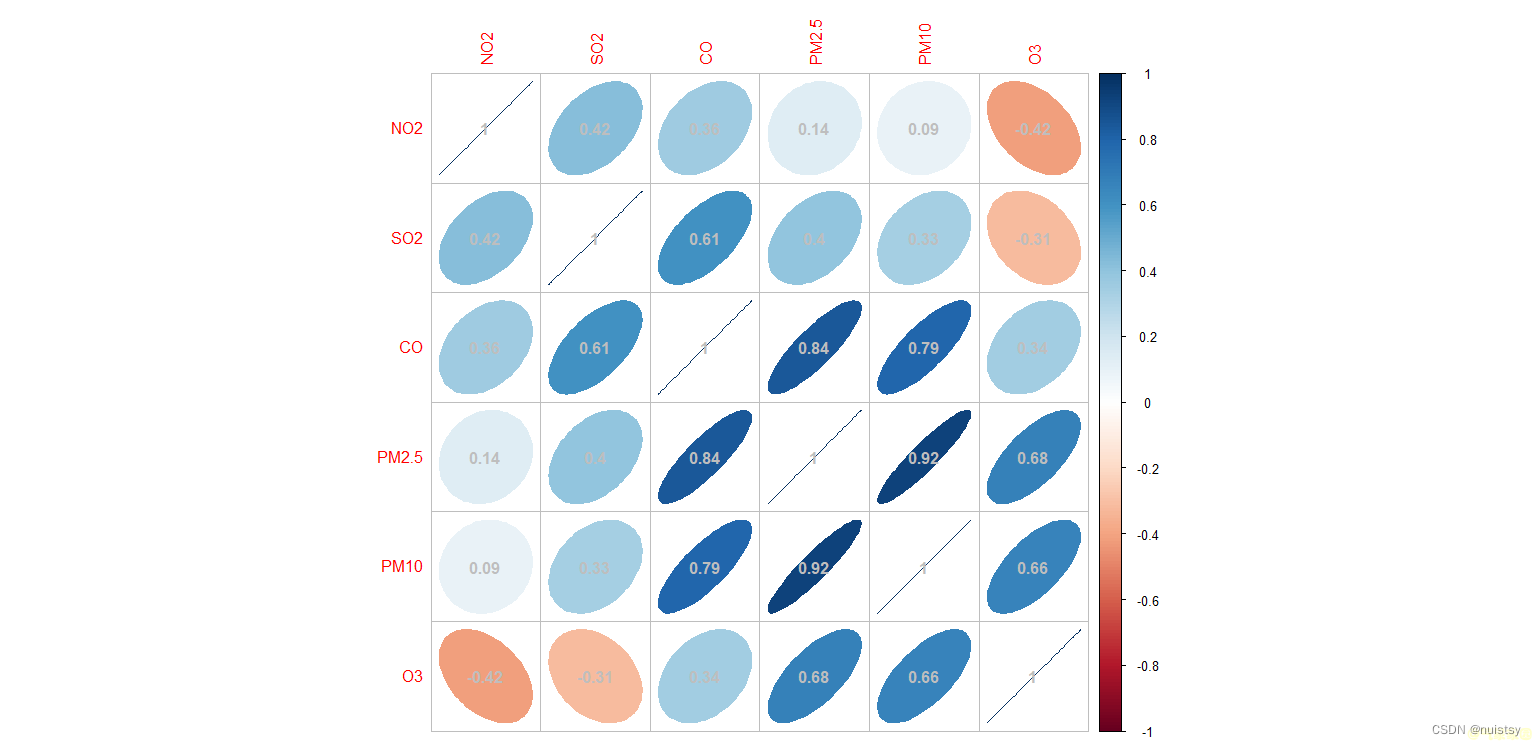 corrplot(corr=cor(data),method = 'ellipse',order = "AOE",addCoef.col = "grey") //绘制相关性图片