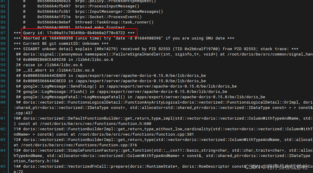 Doris宕机问题排查 二、进入到fe的log文件下,找到fe.audit.log文件,可以通过下面命令知道Query id对应的sql,也可以vim fe.audit.log 然后通过命令:/ Query id 找到对应的sql。一、进入be的log目录下找到be.out日志文件,vim be.out,按大写字母G到最底下,往上找到Query id,复制该id。搭建的doris集群有段时间总是宕机,起初不懂如何检查问题所在,后来请社区的开发人员帮忙排查,现记录一次排查步骤。