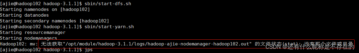 Hadoop启动yarn报错 Hadoop启动yarn的时候,无法获取"/opt/module/hadoop-3.1.1/logs/hadoop-ajie-nodemanager-hadoop102.out" 的文件状态(stat): 没有那个文件或目录解决办法进入 vim /opt/module/hadoop-3.1.3/etc/hadoop/workers,删除localhost,如果已经删除,就是hostname可能写的有问题,hostname前后不允许有空格...