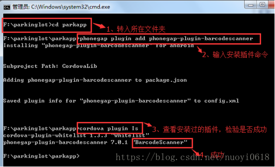 插件安装过程如2.2。新建phonegap程序,cordova create hello com.example.cordova hellopark,跳转到文件夹内 cd MyBarcode,添加android平台cordova platform add android,利用nodejs添加插件,输入phonegap plugin add phonegap-plugin-barcodescanner。