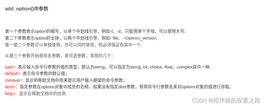 这段代码演示了如何在Python中使用optparse模块解析命令行参数。它定义了多个选项,包括文件路径、权重文件位置、迭代次数和GPU ID,并在main函数中打印这些参数的值。通过提供-f、-w、-i和-g标志,可以设置相应的参数。