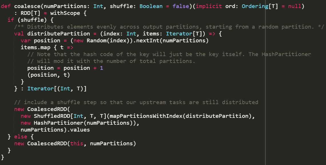 再次定位到coalesce()方法内部,可以看到根据shuffle的条件判断,先通过生成随机数将partition重新组合,随后生成CoalesceRDD进行后续的逻辑处理。