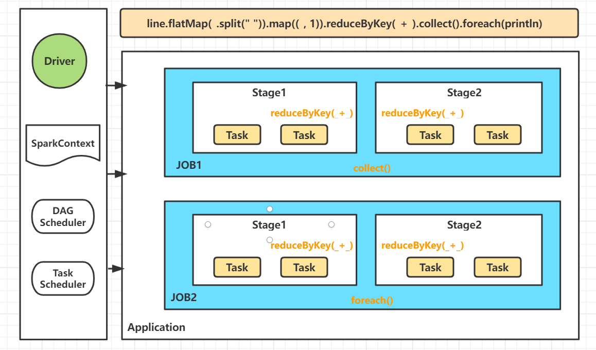 针对一段应用代码(如上),Driver会以Action算子为边界生成DAG调度图。DAGScheduler从DAG末端开始遍历划分Stage,封装成一系列的tasksets移交TaskScheduler,后者根据调度算法, 将taskset分发到相应worker上的Executor中执行。