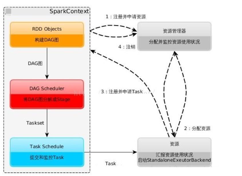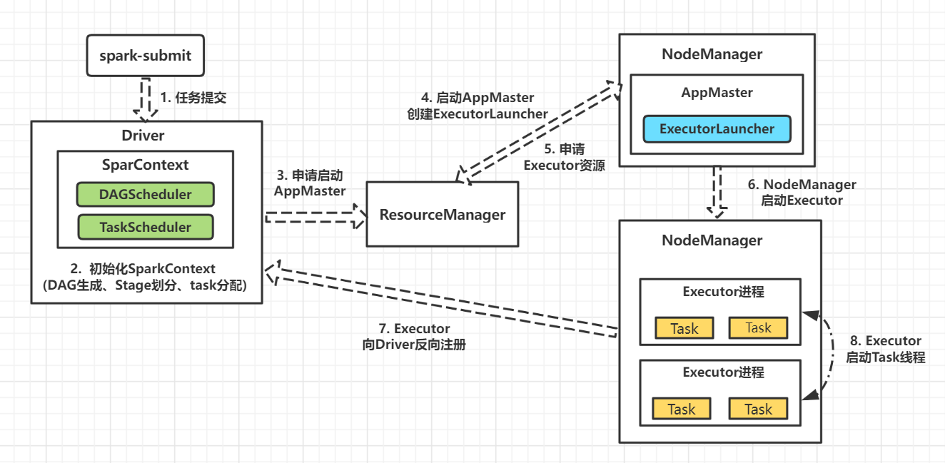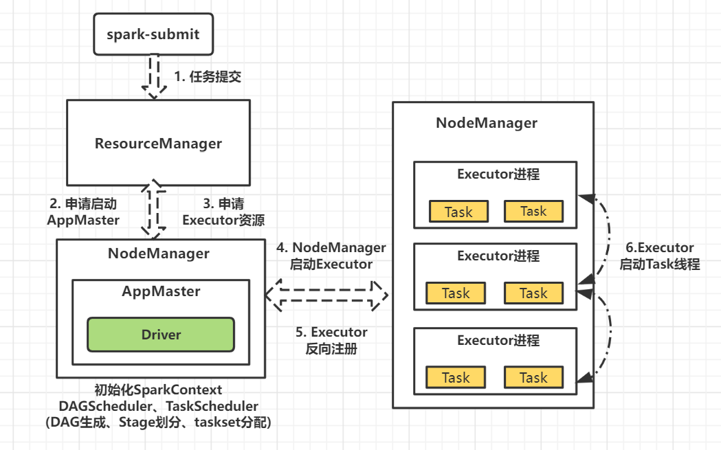 Driver进程并初始化SparkContext SparkContext向Cluster Manager申请资源Cluster Manager选择合适的worker节点创建executor进程Executor向Driver端注册,并等待其分配task任务- SparkContext构建DAG图(有向无环图)、划分
