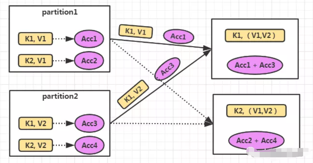 聚合算子内部调用的基础算子之一,程序调用CombineByKey算子时会在本地预先进行规约计算,类似于Mapreduce Shuffle中Map阶段的Combine阶段,先看一下执行原理: