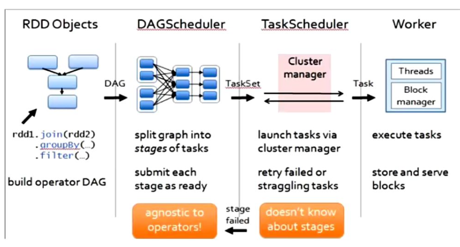 面向stage调度机制的高级调度器,为每个job计算stage的DAG(有向无环图),划分stage并提交taskset给TaskScheduler。 - 追踪每个RDD和stage的物化情况,处理因shuffle过程丢失的RDD,重新计算和提交。