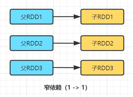 - 窄依赖: 父RDD每个分区被子RDD的一个分区使用
