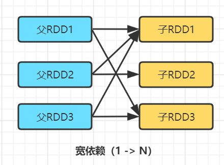 - 宽依赖: 父RDD每个分区被多个子RDD分区使用
