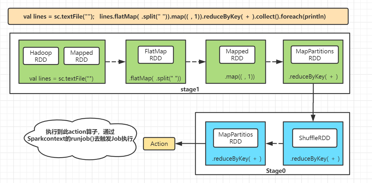 finalStage。 - 遍历过程中如果发现该rdd是宽依赖,则为其生成一个新的stage,与旧stage分隔而开,此时该rdd是新stage的最后一个rdd。