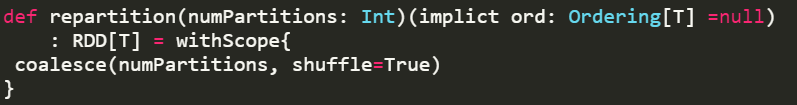 首先打开repartition的源码,可以看到方法仅存在一个参数: numPartitions(分区数),这里表示需要合并的分区数量。再细看内部调用的是coalesce(shuffle=true)函数,即核心逻辑还是由coalesce()实现,且过程会产生shuffle操作。
