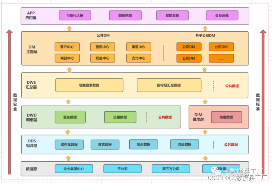 ODS层: 贴源层。旨在集团、子公司、互联网及三方外部数据输入层,基本保持源表原貌(存在敏感数据加密)。 DW层: 数仓层。可细分为dwd和dws子层。-