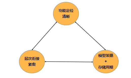 功能定位明确:数据层的定位应清晰,即每层的功能和用途需要保证明确单一,避免由于设计上的交叉重复导致混乱和低效,造成后续维护困难。 -