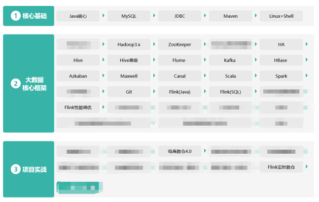 主要是Hadoop生态圈那一套:java基础->hadoop->hive->spark->flink,能满足日常业务需求。