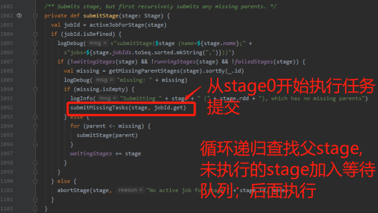 4.2)如果当前stage存在未提交的父Stage,递归调用submitStage()直到最开始的stage0。并将当前stage加入waitingStages等待执行队列中,后续执行