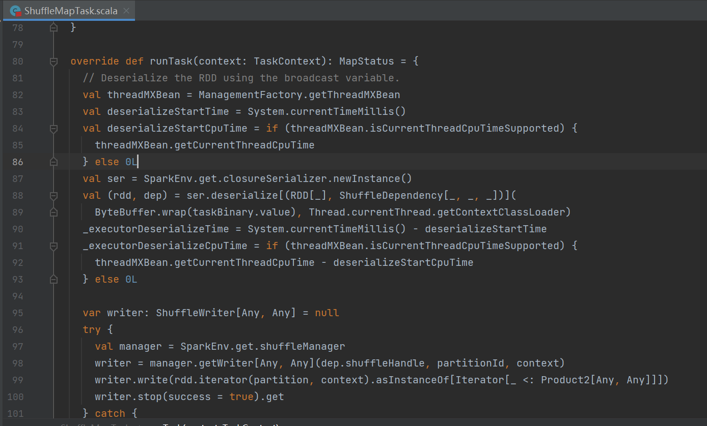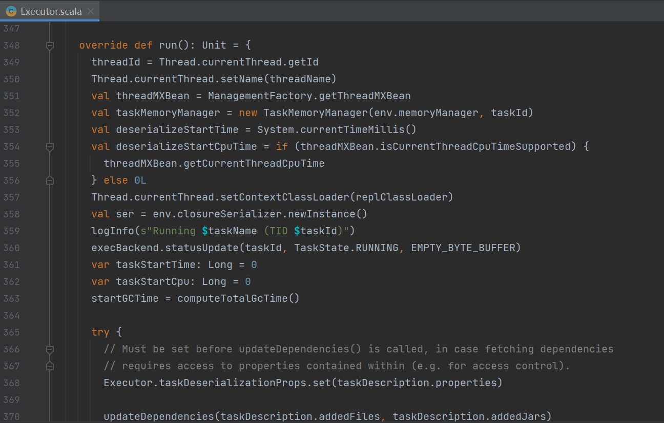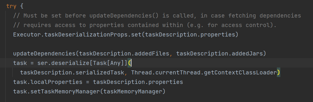 前面说到Executor创建TaskRunner线程并执行。TaskRunner线程首先反序列化程序代码和数据,然后进行后续操作