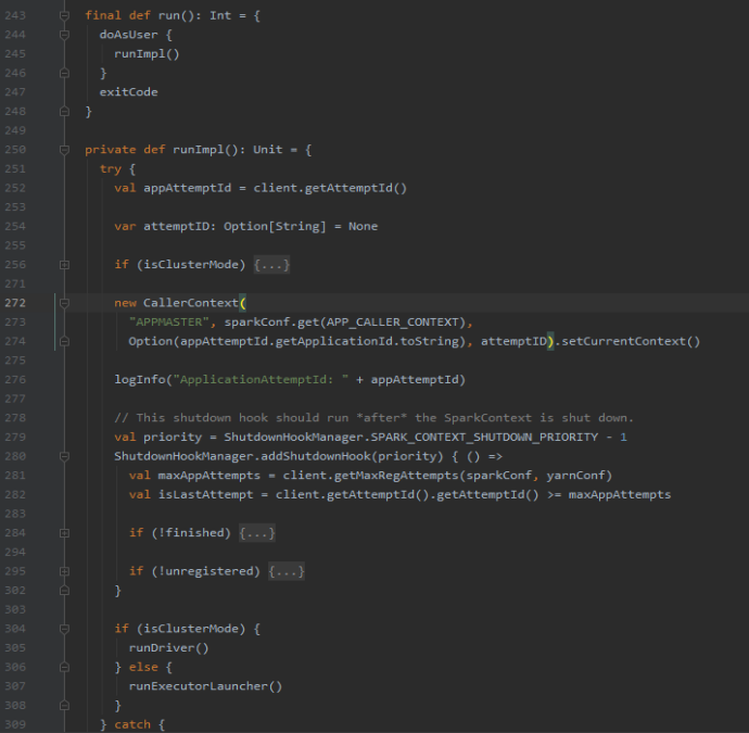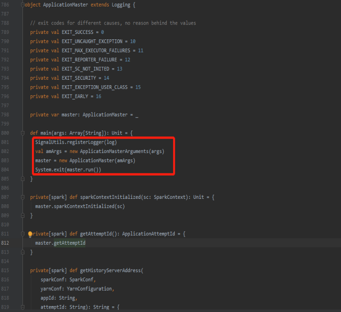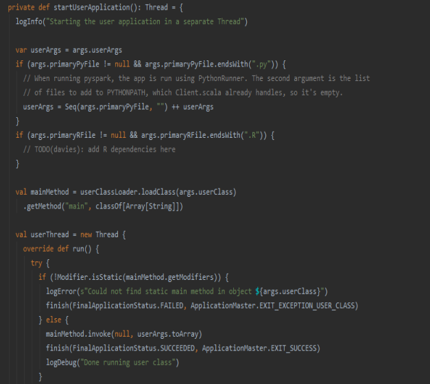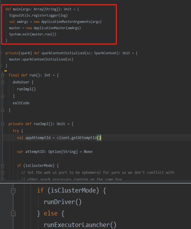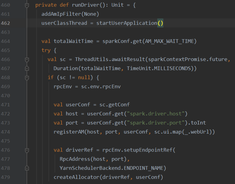 这里是YarnCluster模式下的MainClass执行逻辑,Driver在Yarn的ApplicationMaster上启动,进行SparkContext初始化。