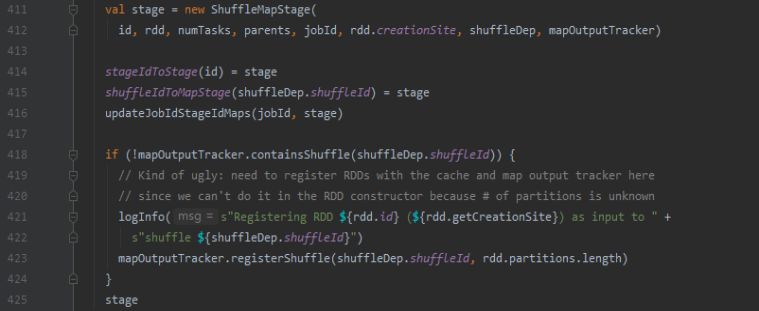 mapOutputTracker是否包含该shuffle stage信息,没有则将该shuffle信息(shuffleId/partition数量)封装为shuffleStatus注册到mapOutTracker中, 后续Driver上的mapOutTrackerMaster根据这个shuffleId查找该shuffle信息