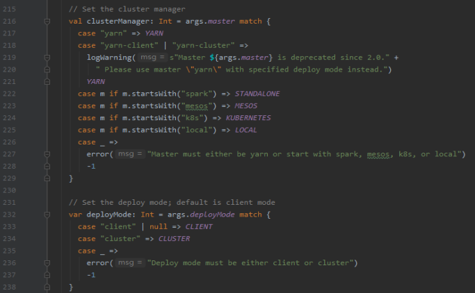 1) 根据参数中master/deploy-mode配置,设置对应的clusterManager和部署模式(YARN/STANDALONE/MESOS/K8S/LOCAL CLIENT/CLUSTER)