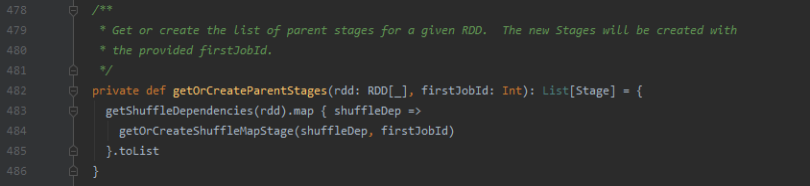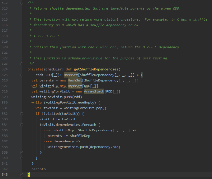 ShuffleMapStage。此过程循环调用直到所有的depedencies全部遍历完成,完成RDD的所有shuffleMapStage的创建