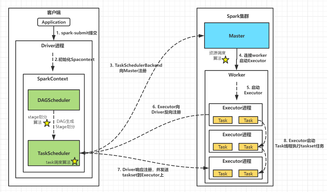整体讲解内容分为:任务提交->Driver注册启动->SparkContext初始化->Executor启动->Task启动